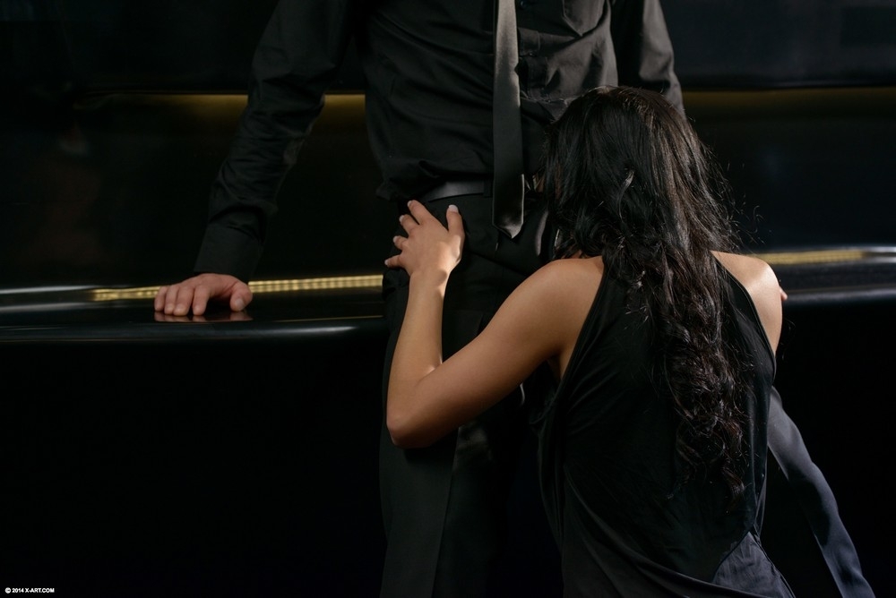 Страстная брюнетка в вечернем платье не дождавшись возвращения парня решила начать без него, и запустила руку в трусики, лаская клитор. Вскоре появился и второй участник и тёлка принялась жадно отсасывать его достоинство, перед тем как получить его в горячую киску. После страстного секса, он кончил на неё.