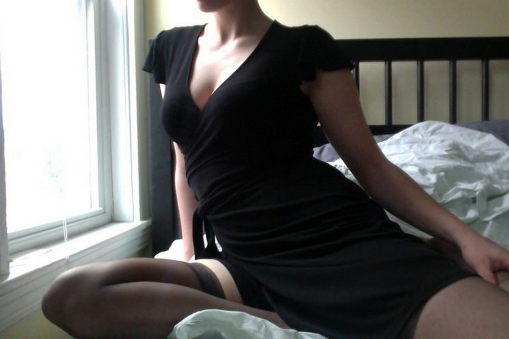 Сексуальная леди в красивом черном платье залезла на кровать и начала позировать перед своим мужчиной. Она пока что не доверяет партнеру, поэтому и старается не показывать свое лица. Девушка ведь не знает для каких целей партнер ее фотографирует. Она снимает с себя платье и начинает позировать уже в нижнем белье, пытаясь поласкать свою киску.