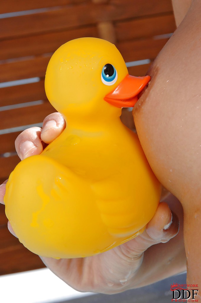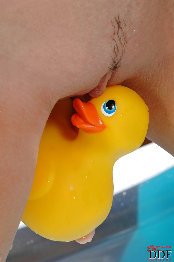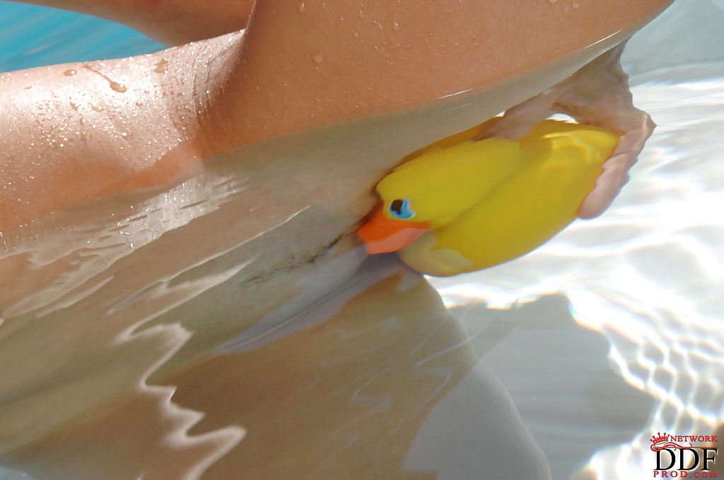 Молоденькая красотка решила немного искупаться в бассейне. Она взяла с собой надувную уточку, чтобы немного поиграть с ней. Когда леди полностью разделась. она показала в камеру свою розовую киску. После этого девица начала ласкать себя этой уточкой и прикладывать ее к дырочке. Девка явно хочет секса, но по какой-то причине рядом нет мужчины, который бы ей вдул.