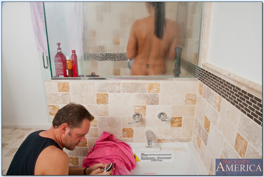 У мужика в квартире отключили воду, поэтому он пошел к одинокой красотке, живущей по соседству. Брюнетка разрешила ему войти, пока сама мылась в душе. Затем телка спалила, как он подглядывает за ним, и в качестве извинений потребовала секс.