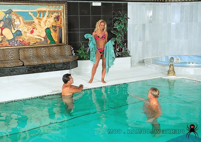 Горячая блондинка развлеклась в двумя мужиками в сауне. Цыпочка выманила их из бассейна своим роскошным телом и не тратя времени на прелюдии стала отсасывать два члена. Постепенно мужики стали осваивать и остальные отверстия блондинки и вскоре драли её одновременно в задницу и киску.