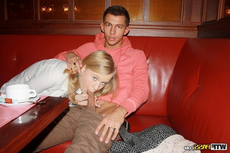 Няшная цыпочка показывает голые сиськи в общественном месте двум парням, а одному из них делает минет прямо в кафе. Этой соске просто не терпится получить крепкий член в свою горячую киску. Уединившись в сартире, тёлка поднимает два конца минетом и трахается с парнями по очереди, после чего те покрывают её мордашку слоем спермы.