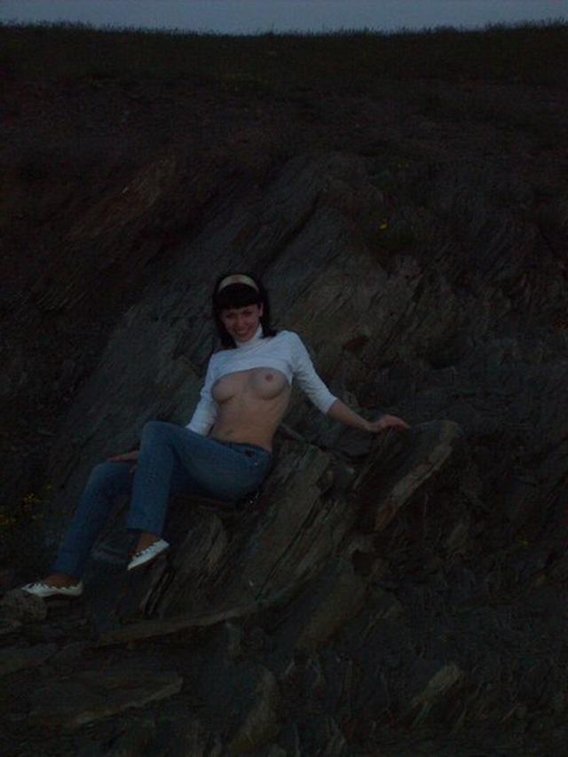 Телочка отправилась с возлюбленным на отдых. Она долго искала место, где можно было бы сфоткаться голышом. Парень предложил скалистую местность, где просто нереально загорать. Именно там деваха и обнажила свое прекрасное тело. Она любит, когда партнер снимает на камеру ее большие сиськи. Телочка также обожает ролевые игры и экстрим на лестничной площадке в подъезде.