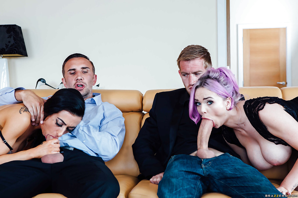 Мужик позвал в гости дружескую пару и как только договорился о встрече, решил помочь своей избраннице накрывать на стол и прибраться в доме. Вскоре вся компания уже сидела за столом и обсуждала последние новости. У хозяйки дома выпал ножик из рук и она залезла под скатерть, чтобы достать его. Однако пассия была возбуждена и тихо решила отсосать мужу. Друзья это заметили и тоже не стали стесняться.